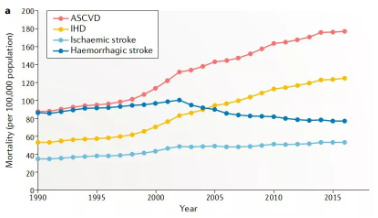 腦卒中、冠心病等心血管疾病(Cardiovascular disease,CVD)是造成我國居民死亡和疾病負擔的首要病因,占中國死亡人口的40%,CVD發(fā)病率呈現(xiàn)逐年快速攀升的趨勢,目前我國CVD患者超過 2.9 億例。動脈硬化性心血管疾?。ˋtherosclerotic cardiovascular disease,ASCVD)是一種單一類型的心血管疾病,包括缺血性卒中(Ischaemic stroke)和缺血性心臟病(Ischaemic heart disease,IHD)。從1990年至2016年,ASCVD的死亡人口增加近100萬,據(jù)統(tǒng)計2016年約有240萬人死于ASCVD,占CVD總死亡人口的61%,占所有死亡的25%。