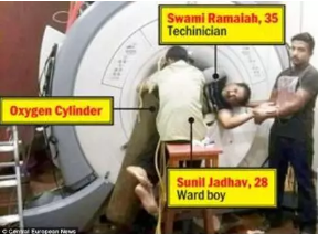 2014年11月8日,印度新孟買的塔塔紀念醫(yī)院發(fā)生了一起罕見的磁共振事故,當(dāng)時,一名男性患者被推入醫(yī)院接受磁共振檢查。在掃描過程中,主治醫(yī)生讓28歲的護工Sunil Jadhav去取一個氧氣面罩。Jadhav從來沒有在MRI檢查室工作過,也不知道MRI附近不允許有任何金屬,他以為醫(yī)生是讓自己去取一個氧氣瓶。