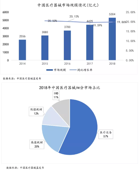 隨著國內經濟水平的發(fā)展,民眾支付能力的提升,人口老齡化的增加,健康需求不斷增加,中國醫(yī)療器械市場保持高速增長。2018年中國醫(yī)療器械市場規(guī)模約為5304億元,同比增長19.86%,預計未來5年將繼續(xù)保持15%以上年復合增速,遠高于國內GDP增速。醫(yī)療設備市場是中國醫(yī)療器械最大的細分市場,占比 56.80%;其次為高值醫(yī)用耗材市場,占比 19.72%,IVD占比約11%。