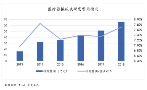 近年我國醫(yī)療器械上市公司的研發(fā)投入和人員占比持續(xù)增長,反映了醫(yī)療器械行業(yè)發(fā)展進程對國內企業(yè)的研發(fā)提出了越來越高的要求,行業(yè)逐步由銷售驅動,轉向研發(fā)和銷售雙輪驅動。但總量依然不足,2018年我國所有醫(yī)療器械上市公司公司的研發(fā)投入總和為65.5億元人民幣,不及1家跨國公司投入。(美敦力在2018年研發(fā)總投入為22.53億美元)