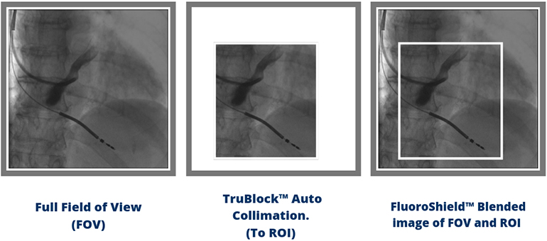 在進行介入程序期間,F(xiàn)luoroShield會利用熒光或電影(跳動的心臟的X射線短片)成像自動將輻射束對準目標區(qū)域。這要歸功于歐米茄的TruBlock自動準直技術。