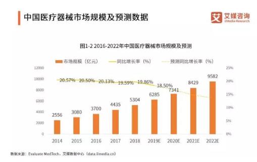 艾媒咨詢數(shù)據(jù)顯示,中國(guó)醫(yī)療器械整體市場(chǎng)規(guī)模已由2014年的2556億元增長(zhǎng)至2018年的5304億元,年均增速保持在20%左右,營(yíng)業(yè)收入及凈利潤(rùn)均保持高速增長(zhǎng)態(tài)勢(shì),屬于醫(yī)療器械行業(yè)發(fā)展黃金期,預(yù)計(jì)到2022年中國(guó)醫(yī)療器械市場(chǎng)規(guī)模將超過(guò)9000億元。