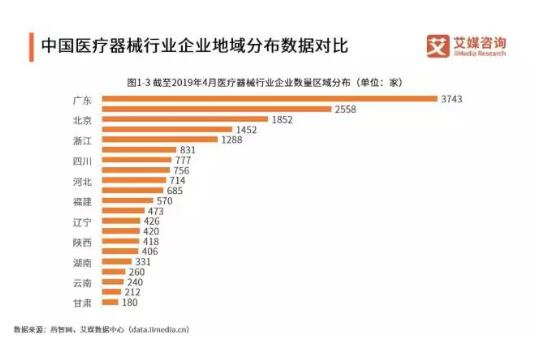 國(guó)內(nèi)醫(yī)療器械企業(yè)主要集中在珠三角、長(zhǎng)三角以及京津冀環(huán)渤海三個(gè)地區(qū),截至2019年4月,全國(guó)共有醫(yī)療器械類企業(yè)約1.88萬(wàn)家,其中以廣東、江蘇和北京為典型省市,擁有醫(yī)療器械企業(yè)數(shù)量分別為3743家、2558家和1852家。