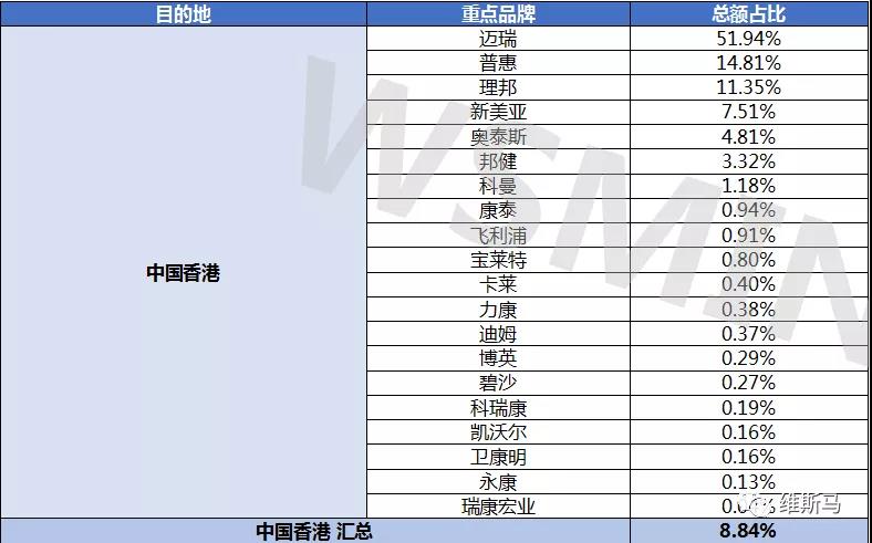 中國香港市場為中國心電圖出口第三大市場,共計25家出口商,占全年心電圖出口8.84%的份額, 其中深圳邁瑞在中國香港市場占有率高達(dá)51.94%。