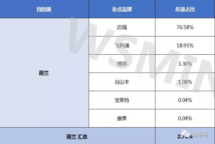 荷蘭市場為中國心電圖出口第七大市場,共計6家出口商,占全年心電圖出口2.76%的份額。其中深圳邁瑞在荷蘭市場占有率高達(dá)76.58%。
