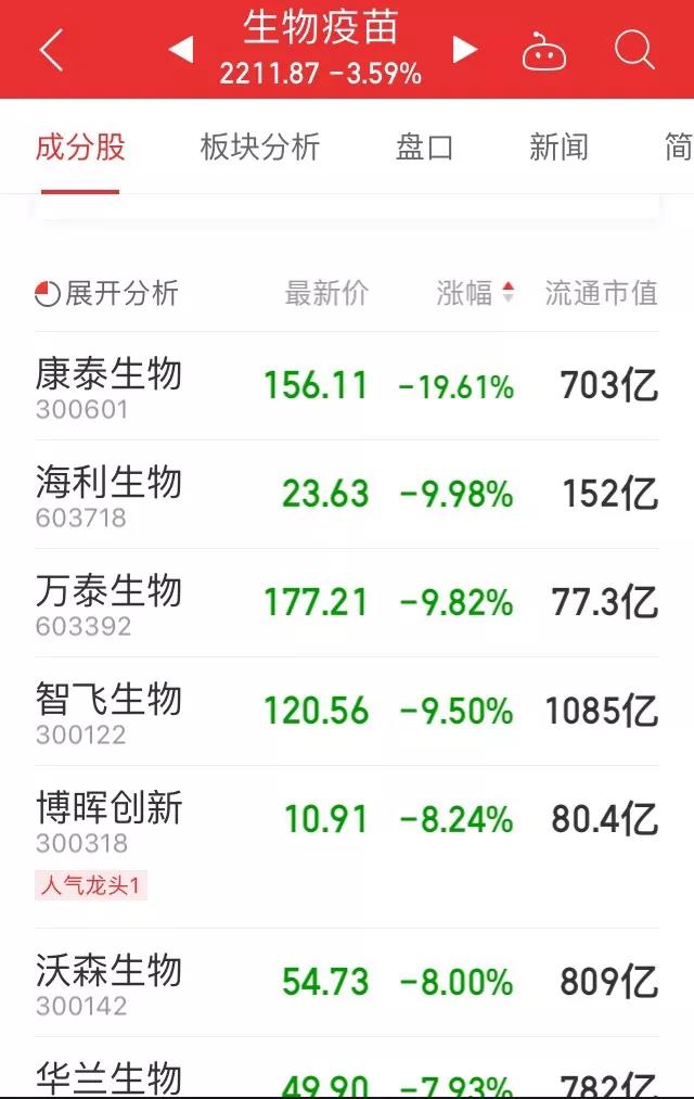 受此消息影響,9月9日,A股生物疫苗概念盤中遭遇重挫,截至午盤,康泰生物逼近跌停,成為創(chuàng)業(yè)板第一支跌停的股票,海利生物跌停,萬泰生物逼近跌停,智飛生物跌逾9%,沃森生物跌幅超8%,華蘭生物、未名醫(yī)藥等跌逾7%,康華生物跌逾6%。