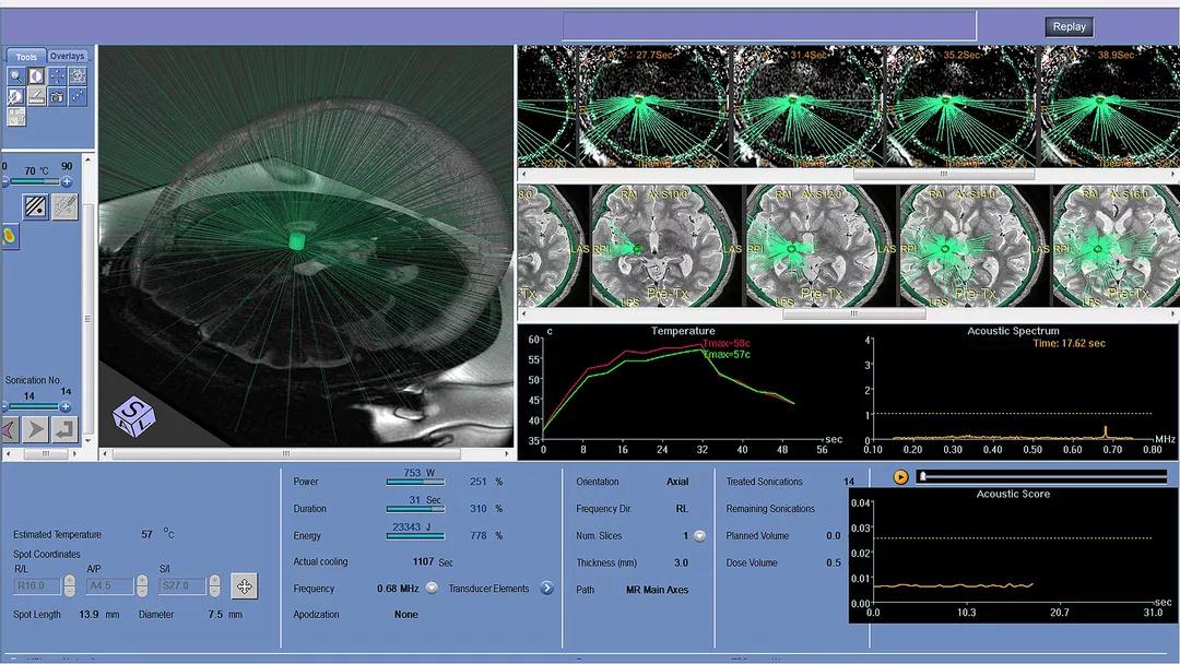 Exablate Neuro 用于對(duì)藥物難治性突發(fā)性震顫患者進(jìn)行單側(cè)丘腦切開(kāi)術(shù)治療。其超聲波可安全穿過(guò)腦顱,聚合后將震顫致病靶點(diǎn)(即丘腦的 VIM 核)加熱融化。