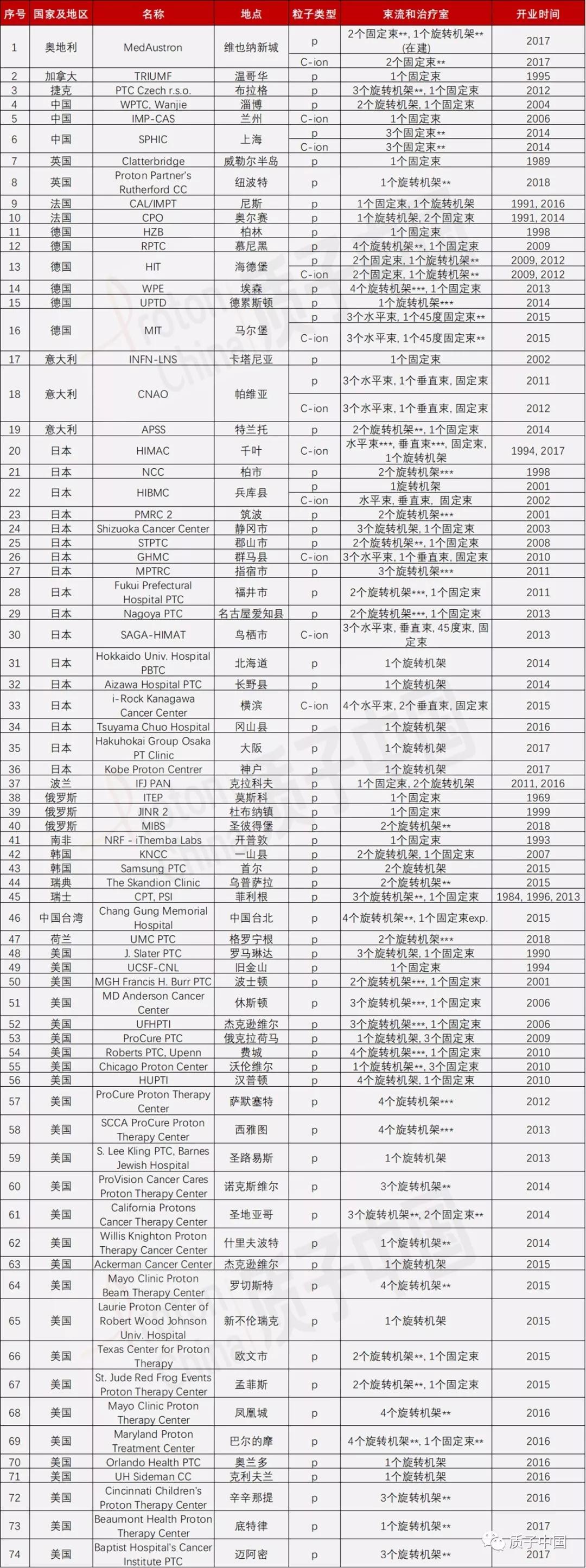 附:全球已運營質(zhì)子重離子治療中心匯總表(截至2018年7月)