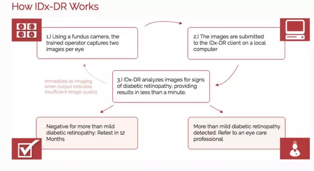 與預約真人醫(yī)生相比,IDx-DR 真的是太方便簡單了,只需要護士或者醫(yī)生通過使用特殊的視網膜照相機拍下患者的視網膜照片,隨后按照 IDx-DR 軟件的指示上傳圖像,并確定圖像的質量是否足夠獲得分析結果。如果圖像合格,軟件將自動分析(無須專業(yè)醫(yī)生參與)患者是否患有糖尿病性視網膜病變,并將根據(jù)結果診斷并決策后續(xù)治療。