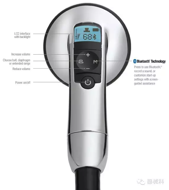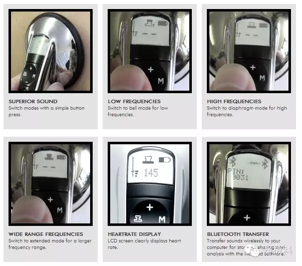 2009年,電子聽(tīng)診器的發(fā)展達(dá)到了新的巔峰,Littmann®3200型電子聽(tīng)診器(上圖)出現(xiàn)在世人面前。這是首個(gè)運(yùn)用藍(lán)牙技術(shù)的電子聽(tīng)診器,它能夠?qū)⑿呐K、肺部和其他身體器官的信號(hào)無(wú)線傳送到醫(yī)師使用的電腦,并通過(guò)Cardioscan軟件實(shí)時(shí)地將聲音曲線顯示在電腦屏幕上,更準(zhǔn)確地揭示患者心臟可能存在的異常現(xiàn)象。隨后,軟件會(huì)對(duì)聲波曲線進(jìn)行分析,并將代表有害雜音的異常部分的細(xì)節(jié)突出顯示出來(lái)。醫(yī)師能夠?qū)⒒胤潘俣冉档鸵话雭?lái)更仔細(xì)地分析問(wèn)題,還能將文件保存到患者的檢查結(jié)果中,并通過(guò)電子郵件和Scope to Scope遠(yuǎn)程聽(tīng)診軟件,將其發(fā)送給心臟病專家來(lái)確認(rèn)診斷結(jié)果。這套系統(tǒng)不僅能夠準(zhǔn)確捕捉到危險(xiǎn)的雜音,還能減少更為昂貴心電圖檢查費(fèi)用和不必要的心臟病專家的診療工作。從此傳統(tǒng)的電子聽(tīng)診器變成了先進(jìn)的醫(yī)療工具,取代了醫(yī)師對(duì)心臟雜音的猜測(cè),提高了診斷能力。隨后3M公司推出了一系列改良產(chǎn)品......目前這方面3M公司的最新產(chǎn)品是Littmann4100系列(下圖)