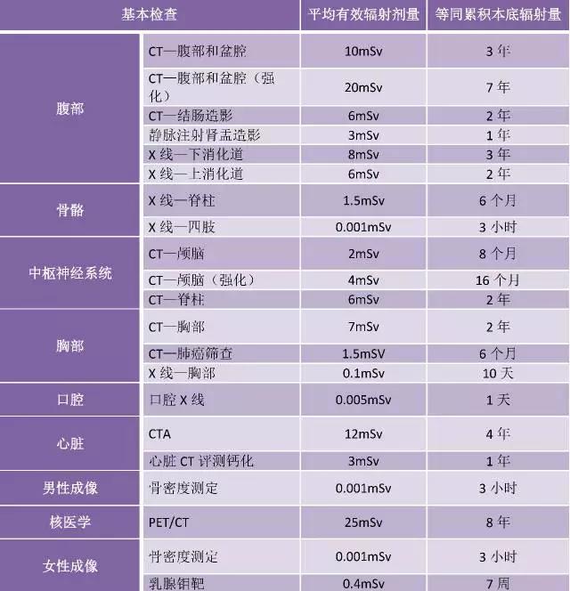 臨床中,常會(huì)遇到患者在影像檢查前問醫(yī)生,是否有輻射,有多大的輻射呢?下圖是ACR,RSNA等組織聯(lián)合制定的常見影像學(xué)檢查平均輻射劑量的參考值,或許可以為你更好的回答患者的問題提供借鑒。
