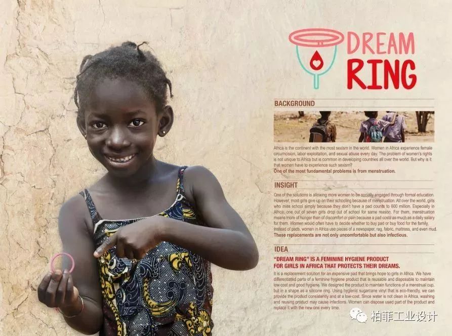 設(shè)計(jì)說明:非洲婦女每天都會(huì)經(jīng)歷性別偏見和歧視,而針對這個(gè)問題所提出的解決方案是讓更多的女性參與正規(guī)教育。無法取得便宜且衛(wèi)生的女性衛(wèi)生用品是許多非洲女孩放棄上學(xué)的主要原因之一。一片衛(wèi)生棉可能會(huì)花掉一天的工資,迫使婦女在經(jīng)期來時(shí)會(huì)使用報(bào)紙、破布、布料甚至泥土。DREAM RING是一款便宜又環(huán)保的女性衛(wèi)生用品,由矽膠環(huán)和甘蔗乙烯制成??芍貜?fù)使用的矽膠環(huán)和拋棄式的甘蔗乙烯是DREAM RING既經(jīng)濟(jì)又安全的關(guān)鍵因素。