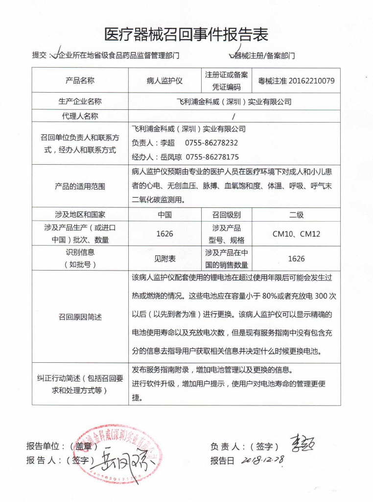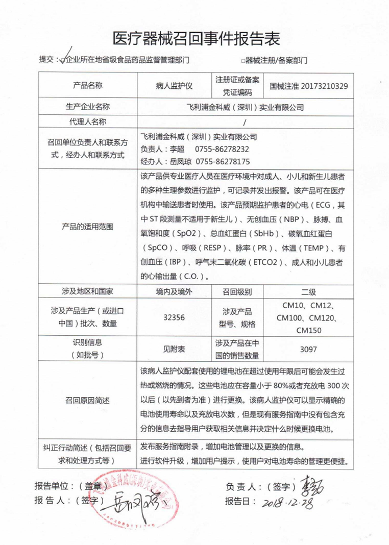 2018年,飛利浦也曾發(fā)布了多起對病人監(jiān)護儀的召回,其中一份召回報告也是二級召回,涉及到2672臺監(jiān)護儀,同樣是通過監(jiān)控內(nèi)部產(chǎn)品投訴發(fā)現(xiàn),存在鋰離子電池超過預(yù)期使用壽命后發(fā)熱或燃燒風(fēng)險。