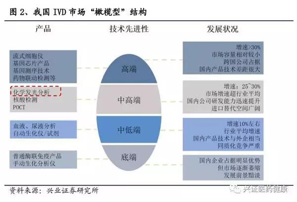 產(chǎn)品結(jié)構(gòu)上,我國體外診斷行業(yè)總體呈現(xiàn)“橄欖型”結(jié)構(gòu):低端市場是前期廣泛使用的檢驗技術(shù),發(fā)展空間小,增速緩慢,正在進(jìn)行方法學(xué)上的更新和迭代;中端市場由于近幾年國產(chǎn)研發(fā)能力迅速提升,渠道優(yōu)勢明顯,國內(nèi)產(chǎn)品正在處在高速發(fā)展階段;高端市場由于技術(shù)壁壘高,國內(nèi)外差異大,主要為國外產(chǎn)品,國內(nèi)產(chǎn)品目前在研發(fā)潛伏期,未來將迎來增長。