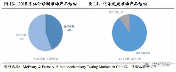 在我國體外診斷市場規(guī)模中,進(jìn)口廠家占據(jù)一半以上的市場份額,國內(nèi)產(chǎn)品呈追趕勢頭。在生化檢驗領(lǐng)域,國內(nèi)廠家基本實現(xiàn)進(jìn)口替代;而免疫、分子等技術(shù)壁壘較高的領(lǐng)域,國內(nèi)廠家前幾年剛剛起步,發(fā)展迅猛?;瘜W(xué)發(fā)光行業(yè)是免疫診斷中技術(shù)最先進(jìn)的部分,目前國內(nèi)市場仍被羅氏、雅培、貝克曼、西門子四巨頭霸占,高端市場尤甚。2011年新產(chǎn)業(yè)推出第一臺全自動化學(xué)發(fā)光儀,國產(chǎn)發(fā)光公司加入市場競爭,目前國產(chǎn)約占10%市場份額,進(jìn)口替代空間巨大。