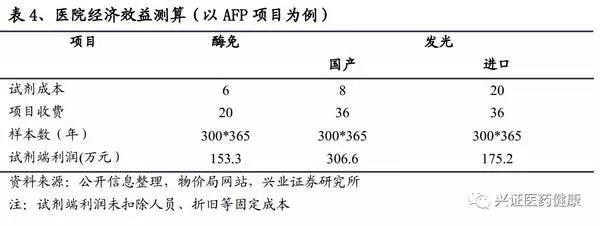以福建某二級醫(yī)院為例計算,需添置一臺發(fā)光儀器做腫瘤標(biāo)志物(以AFP、乙肝HBsAg價格為例)的檢查,日樣本量300個。國產(chǎn)試劑是進(jìn)口試劑售價的30%左右,國產(chǎn)單個發(fā)光試劑反應(yīng)成本在8元,單個酶免試劑成本是進(jìn)口單個發(fā)光試劑反應(yīng)成本在20元,發(fā)光牌價是36元,酶免牌價是20元。如下計算醫(yī)院試劑端利潤: