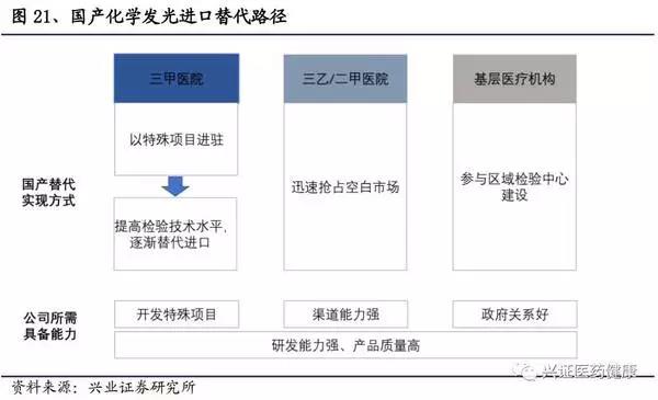 對于三甲醫(yī)院,其技術(shù)偏好較高,從目前的市場反應(yīng)來看,國產(chǎn)發(fā)光儀器和試劑的精確性和穩(wěn)定程度仍不能達(dá)到三甲醫(yī)院的要求。同時三甲醫(yī)院多有聲譽(yù)追求,對進(jìn)口品牌的忠誠度高。在價格上,樣本量大、檢驗結(jié)果質(zhì)量要求高、檢驗人員成本高致使其相對價格不敏感。而國內(nèi)廠家對于試劑的研發(fā)仍停留在檢測項目的拓展上,基于現(xiàn)狀,大規(guī)模進(jìn)口替代較難實現(xiàn)。有些特殊項目未涉及,如藥物濃度檢測等,可作為突破口進(jìn)駐高端醫(yī)院,建立品牌形象??傮w來說,短期內(nèi)國內(nèi)廠商可依靠特殊項目檢查可獲得三級醫(yī)院小部分份額,長期來看,想進(jìn)駐高端醫(yī)院并獲得主力項目的份額,須加大研發(fā)投入,做好做精發(fā)光試劑,打破醫(yī)院對于國產(chǎn)山寨的慣性認(rèn)知。