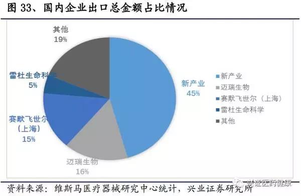 渠道能力強(qiáng),國內(nèi)外銷售情況表現(xiàn)不俗。新產(chǎn)業(yè)采用經(jīng)銷為主,直銷為輔的模式進(jìn)行銷售。在國內(nèi)市場,新產(chǎn)業(yè)終端用戶分布范圍廣,省份分散,覆蓋醫(yī)院3000多家。其中,二級醫(yī)院有1千多家,三級醫(yī)院近1千家,一級醫(yī)院較少。今后,一級醫(yī)院市場將被充分開發(fā),將通過自購或者區(qū)域檢驗中心的方式,將免疫檢測技術(shù)更新至化學(xué)發(fā)光法,市場空間巨大。在出口方面,儀器出口收入占到總收入近一半,試劑出口收入占到10%左右。2016年出口總額為國內(nèi)第一,占到總金額的45.6%。