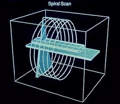 在治療之前,先由KVCT對病人進行斷層掃描,根據(jù)此掃描圖像由治療計劃系統(tǒng)進行逆向治療計劃設(shè)計,即各個角度束流形狀及流強分布設(shè)計;也既計算出在治療環(huán)每一個旋轉(zhuǎn)角度和治療床前進的每一個位置上的多葉準直器各個葉片的確切位置。然后打開加速器,用MVCT再核準病灶位置;如有錯位,預(yù)先進行調(diào)節(jié);在治療過程中,治療環(huán)旋轉(zhuǎn)和治療床勻速前進,進行螺旋照射,見圖(2)