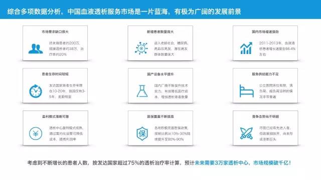 導語:《關于印發(fā)血液透析中心基本標準和管理規(guī)范(試行)的通知》中提到血液透析中心屬于單獨設置的醫(yī)療機構,為獨立法人單位,由省級以上衛(wèi)生計生部門設置審批。國家從政策上鼓勵血透中心向連鎖化、集團化發(fā)展,對擬辦集團化、連鎖化血液透析中心的申請主體,可以優(yōu)先設置審批。未來一大批社會辦血透中心將誕生,并實現(xiàn)區(qū)域醫(yī)療資源共享。也就是說,“獨立血液透析中心”即將迎來爆發(fā)期。